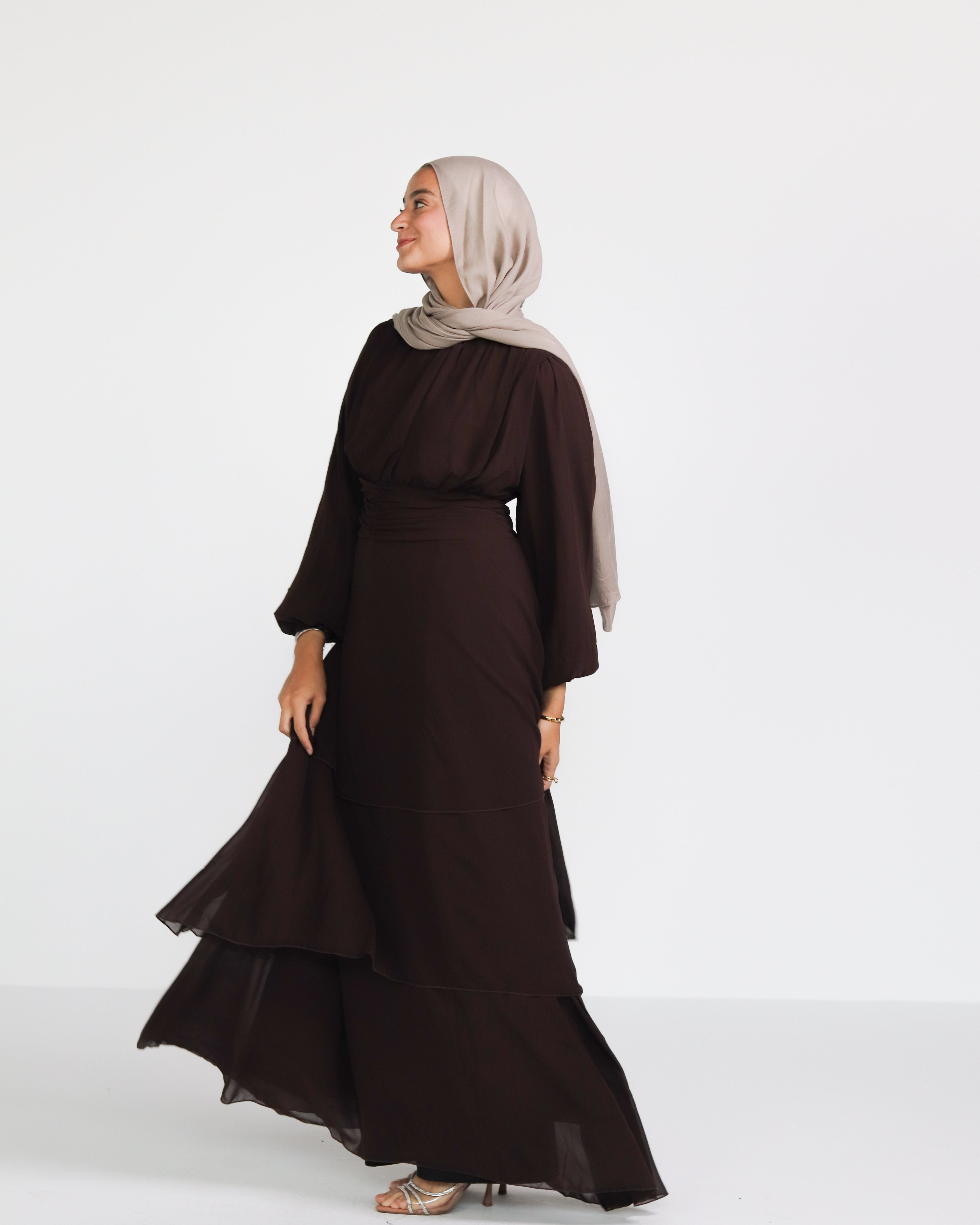 This elegant Choco ruffle chiffon dress features a lightweight, flowy design perfect for any occasion. The ruffled detailing adds a touch of femininity, while the soft chiffon fabric ensures comfort and grace. Ideal for both occasions and special events, this dress offers a chic and timeless look.
